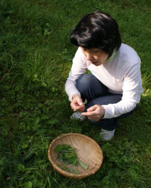 野草園(jomonガーデン)のくぼ地に新芽をのぞかせるドクダミ、落ち葉に隠れて大きくなるユキノシタ、たくましいオオバコ、そして人類がふるいにかけて選んだチャノキ、ビワやシナモンの葉っぱも野生茶の対象です。